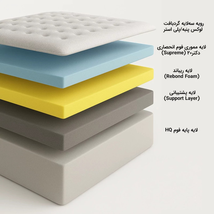 طراحی ارگونومیک: طراحیشده بر اساس آناتومی طبیعی ستون فقرات و فرم بدن مناسب برای خوابیدن به پشت، شکم و پهلو، با تمرکز بر پشتیبانی قویتر از کمر و لگن پشتیبانی یکنواخت از کل بدن از سر تا پا جلوگیری از فرو رفتگی بدن و حفظ راستای ستون فقرات انتخابی ایدهآل برای کسانی که تشکی سفت، طبی و با دوام بالا میخواهند مزایای پزشکی و راحتی: کمک به همترازی صحیح ستون فقرات در طول خواب کاهش فشار بر دیسکها و جلوگیری از خمیدگی یا بدفرمی کمر مناسب برای افرادی که پزشک خوابیدن روی تشک سفت را توصیه کرده (کمردرد، دیسک کمر، مشکلات اسکلتی–عضلانی) جلوگیری از حرکات ناخواسته و برهمزدن خواب در طول شب دوام و ثبات بیشتر در مقایسه با تشکهای نرمتر جنس و ساختار: پارچه گردبافت ضدحساسیت و تنفسپذیر با قابلیت تهویه عالی ۸ کپسول جریان هوا: نفس کشیدن تشک برای خوابی تازه و خنک در تمام طول شب لایه مموری فوم انحصاری دکتر20 (Supreme): انطباق تدریجی با انحنای بدن و کاهش نقاط فشار روی شانهها و کمر لایه ابر ریباند (Rebond Foam): تراکم بالا، استحکام و طول عمر زیاد؛ پشتیبانی قوی از بدن و جلوگیری از فرورفتگی لایه پشتیبانی (Support Layer): یکنواختسازی فشار و افزایش پایداری تشک لایه پایه HQ: ساختار مستحکم بدون فنر، برای ثبات کامل و حذف انتقال حرکت میان دو نفر. پشتیبانی و خدمات پس از فروش 50 روز پشتیبانی ویژه: امکان تغییر ساختار تشک (نرمتر یا سفتتر) بدون هیچ هزینه ۵ سال ضمانت تعویض: پوشش کامل مشکلات ناشی از تولید یا مواد اولیه امکان سفارشیسازی سایز بر اساس نیاز مشتری ارسال سریع و مطمئن به سراسر کشور مشخصات فنی: ابعاد: (تمام سایز های استاندارد تخت – سایر سایزها قابل سفارش) ارتفاع: 30 سانتیمتر درجه نرمی: Hard (۸–۹ از ۱۰) → سفت و کاملاً طبی بدون فنر با پشتیبانی کامل